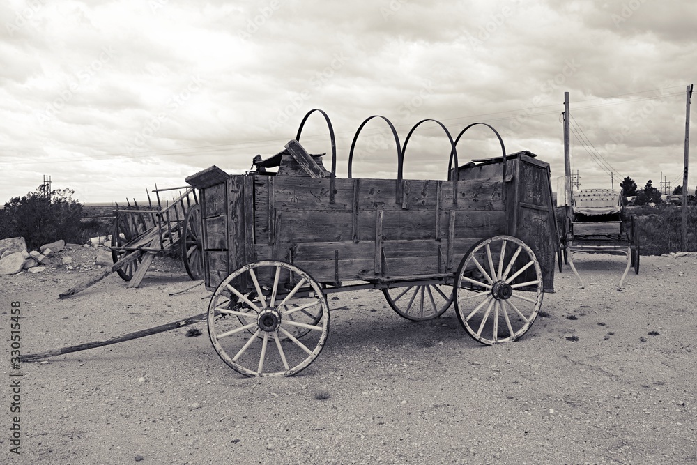 Black and white filter photo of old west covered wagon with no canvas