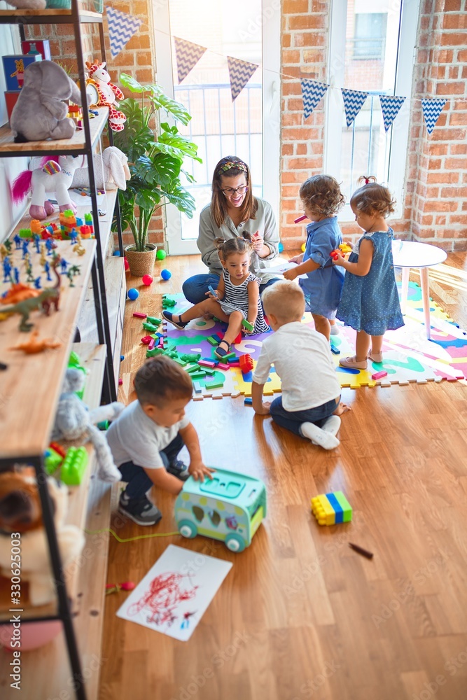 Beautiful teacher and group of toddlers playing around lots of toys at kindergarten