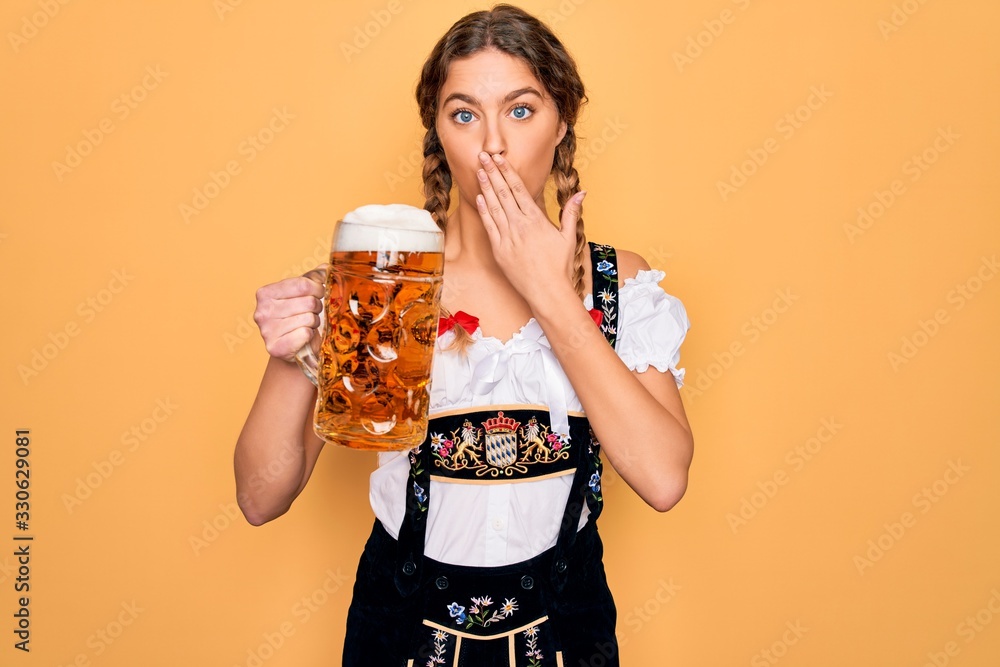 Beautiful blonde german woman with blue eyes wearing octoberfest dress drinking jar of beer cover mouth with hand shocked with shame for mistake, expression of fear, scared in silence, secret concept