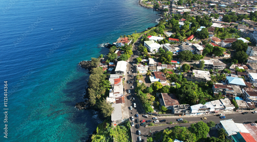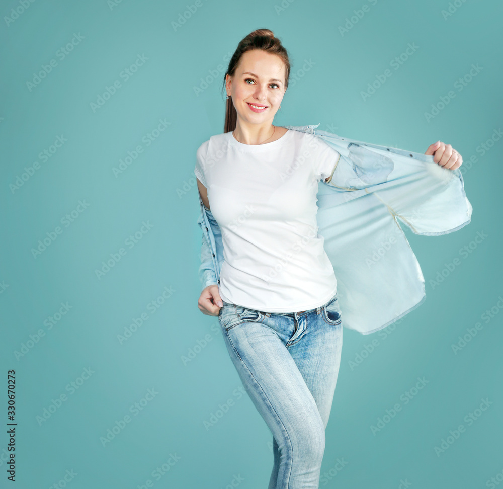 Young girl in white shirt and denim clothing smiling portrait.Caucasian woman on blue background.