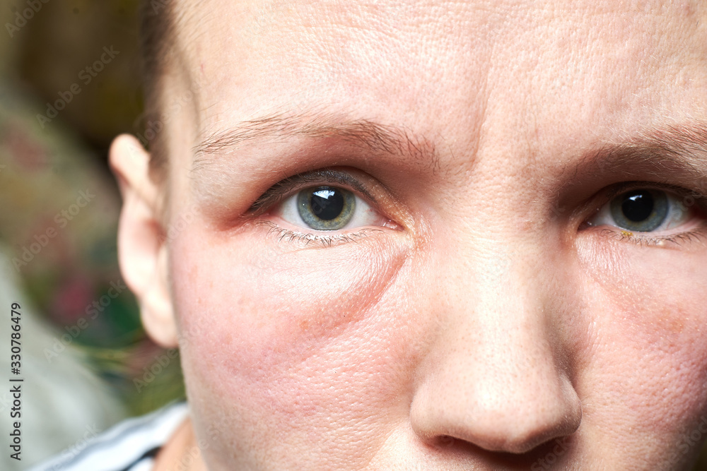 Swollen face of a woman under the eyes, swelling. An allergic reaction to drugs, cosmetics.