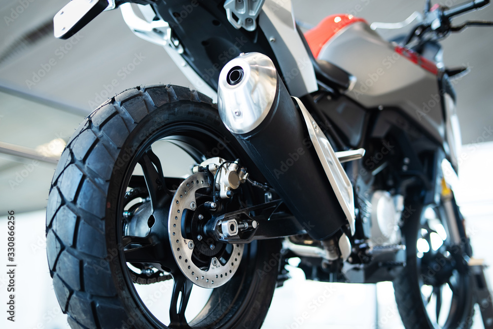 Rückansicht eines Motorrads, Schalldämpfer, Auspuff