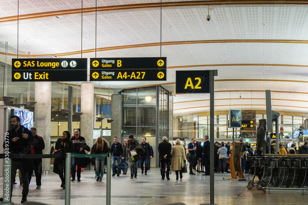 Oslo / Norway - November 30 2019: people at Gardermoen airport terminal for departure flight to travel aboard