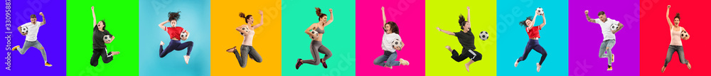 Collage of 5 young emotional jumping people on multicolored bright background. Concept of human emotions, facial expression, sales. Header, banner or proposal flyer. Sport, soccer, football fans.