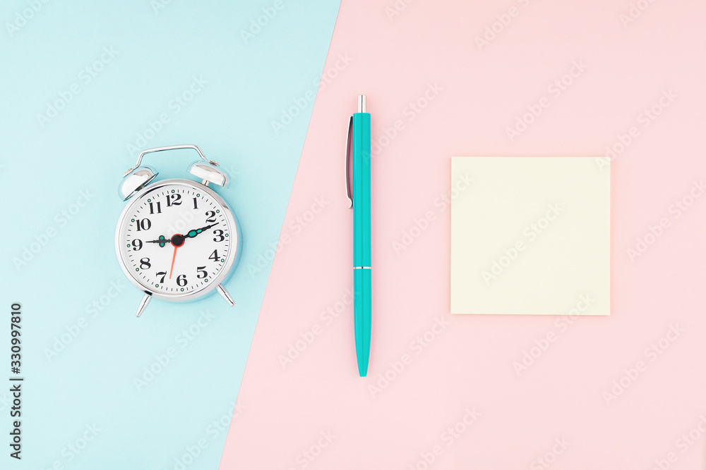 Metal vintage alarm clock with office pen and yellow sticky notes on colorful paper background. Work and planning time flat lay concept
