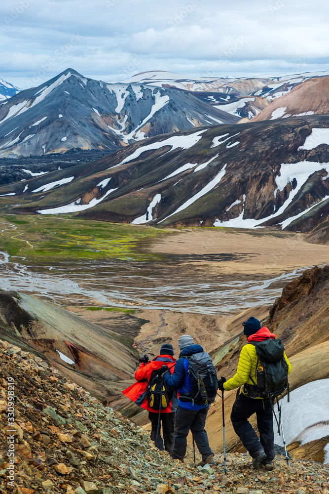 Hikers go down in the colourful mountains, Landmannalaugar in the Iceland