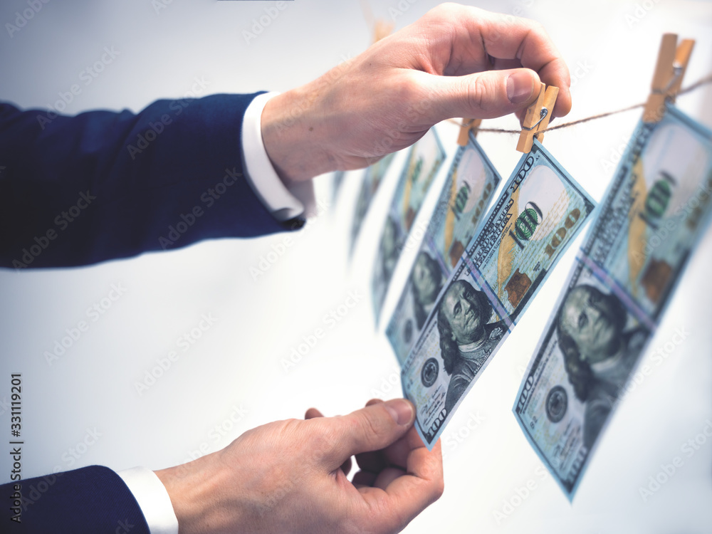 Washing money concept. Businessman is laundering money, 100 Dollar bills hanging on a washing line. Symbol of money laundering. Soft focus.