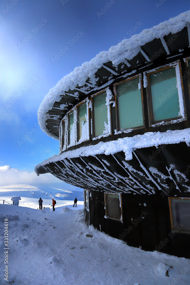 KARPACZ, POLAND - MARCH 08, 2020: A disc-shaped observatory with a weather station and restaurant was built in 1974, located on the peak of Sniezka mountain, Karkonosze National Park, Poland, Europe.
