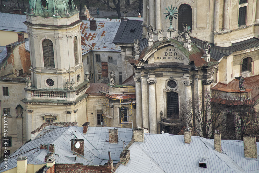 Lviv panorama. Aerial view on the old centre of Lviv in Western Ukraine, with on the left the Uspensky church and on the right the Dominican church and the Town Hall