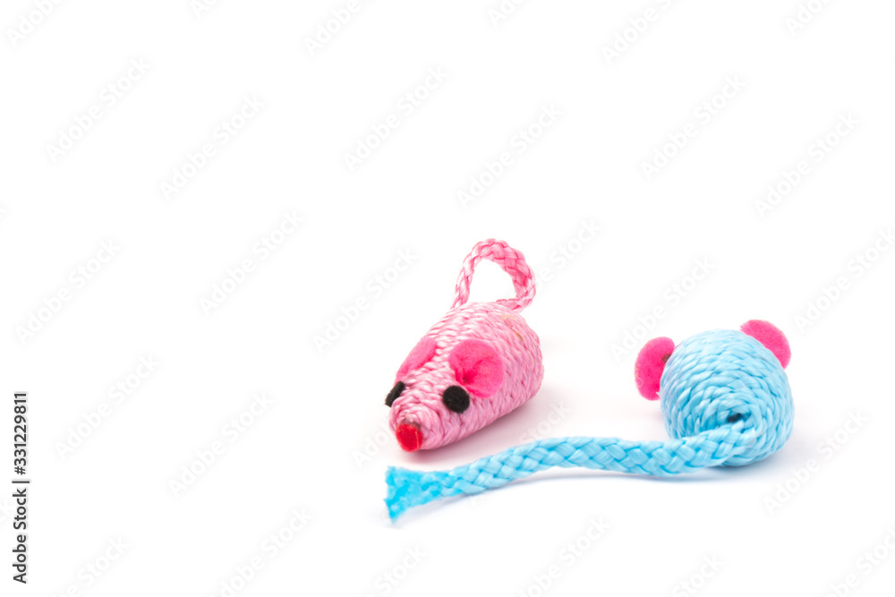 blue and pink toy mouse for pet isolated on white background