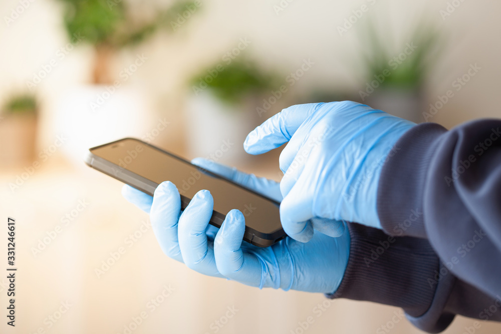 man hands in gloves using smartphone, preventing germs coronavirus bacteria