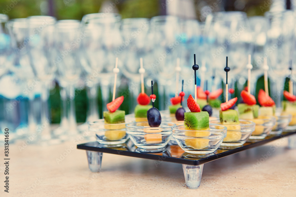 Assorted canapes of fruit and cheese on a glass platter on the background of glasses and champagne. Catering