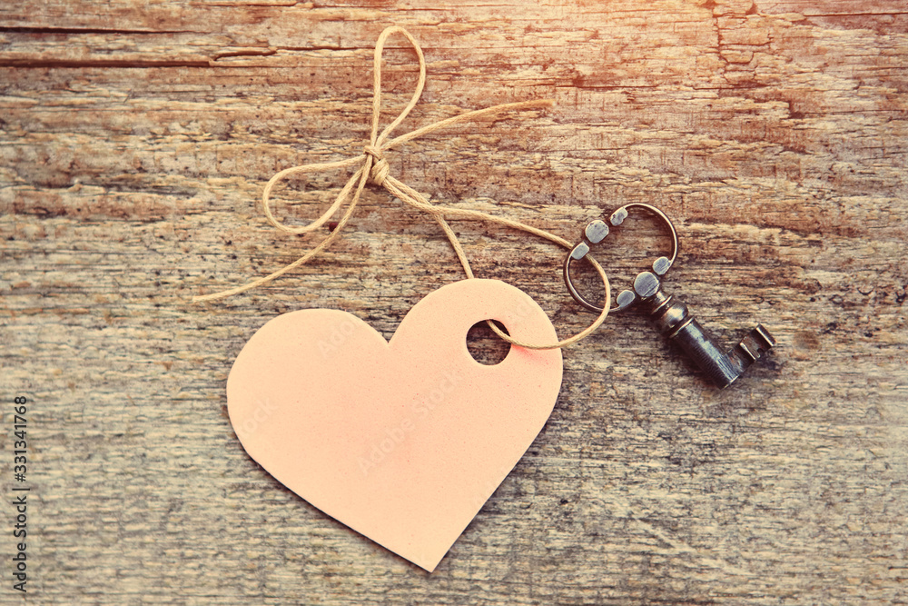 Vintage key and pink heart on a string with a bow. Valentine. Space for text. Close-up, top view