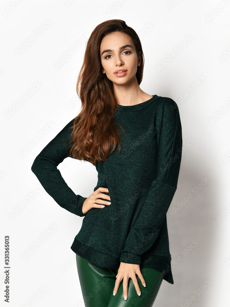 Young beautiful brunette woman is posing in casual black sweatshirt jersey and brown leather jeggings