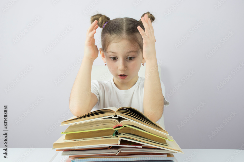 beautiful Caucasian little girl looks surprised at a stack of books, education concept