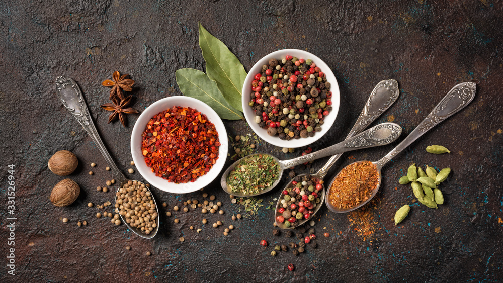 Different spices, dry kitchen herbs and seeds for tasty meals