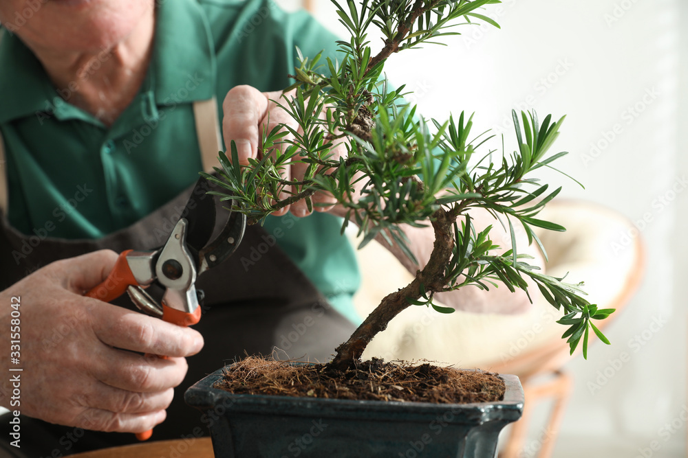 Senior man taking care of Japanese bonsai plant indoors, closeup. Creating zen atmosphere at home