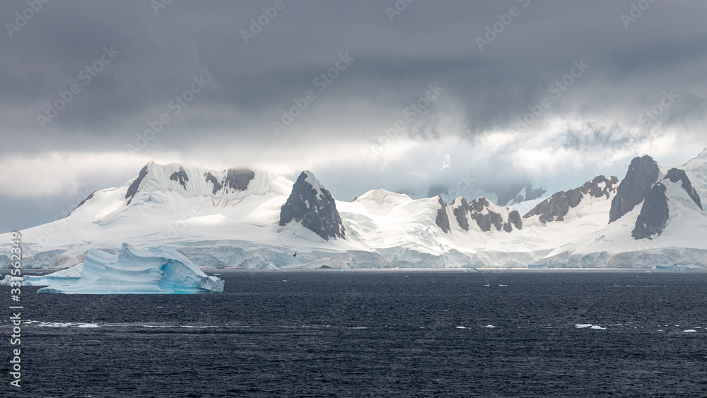glacier in the mountains coastline of antarctica with rocks and snow at the sea with clouds and iceberg