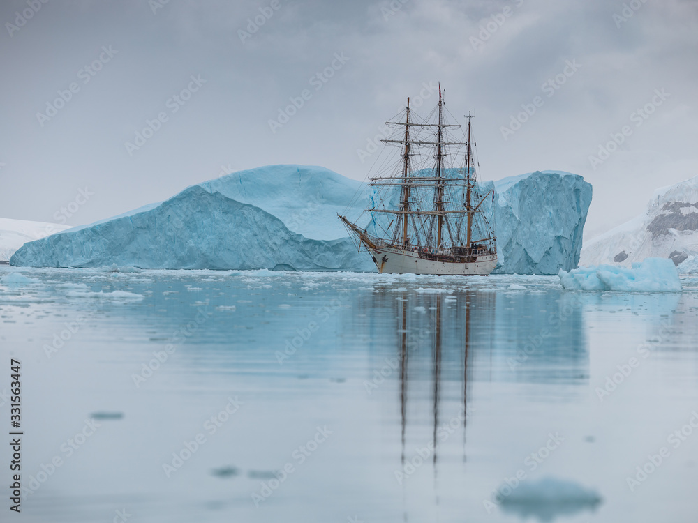 sailing Expedition ship in antarctica surrounded by ice and ice