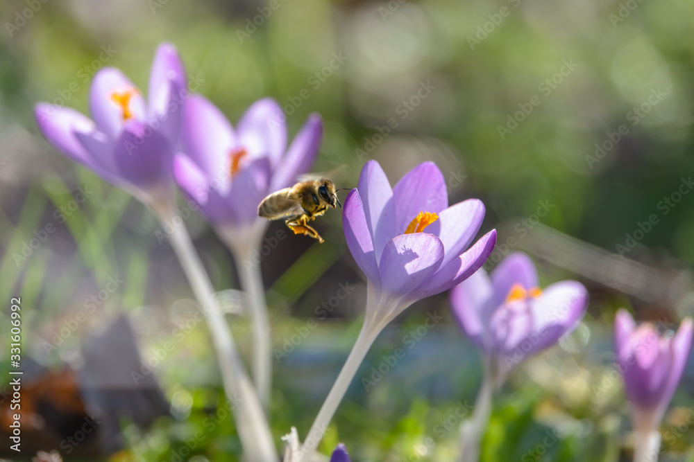Biene schräg im Anflug auf Elfen- Krokus