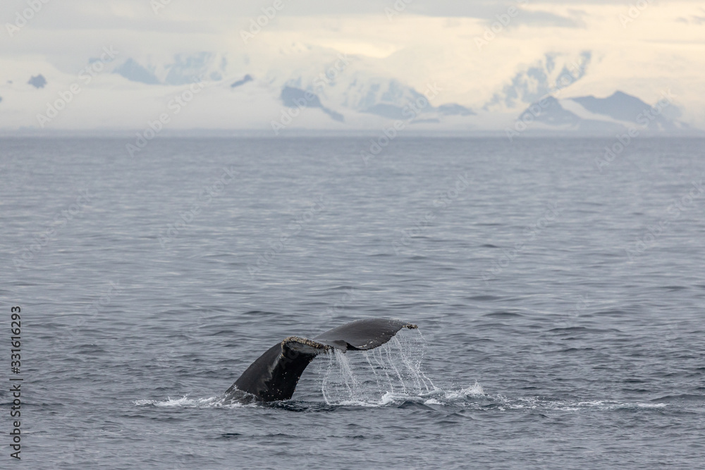 Wal in der Antarktis, Schwanzflosse, Berge und Gletscher im Hintergrund