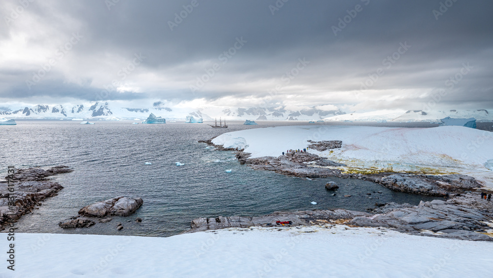 Antarktis Landschaft mit Bucht und Schnee und Eis. Gletscher und Eisberge im Hintergrund und mit einem Segelschiff