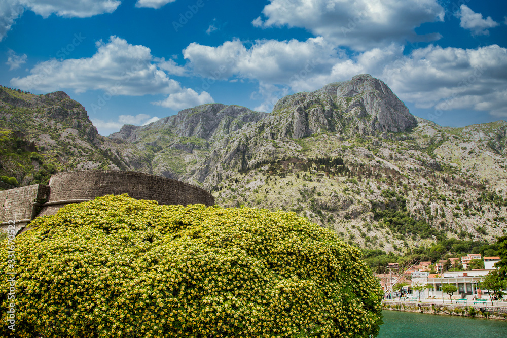 Blooming shrub over harbor under mountains of Kotor, Montenegro