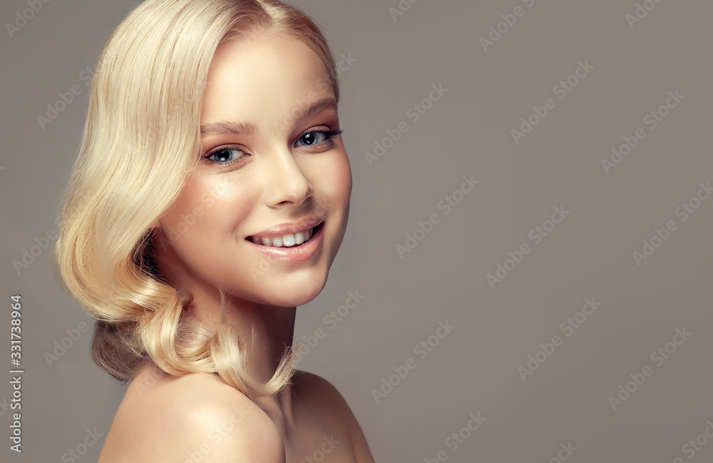 Blonde woman with curly beautiful hair on gray background. Girl with pleasant smile. Short wavy hairstyle. Clean and delicate look. Skin Care, beauty and spa