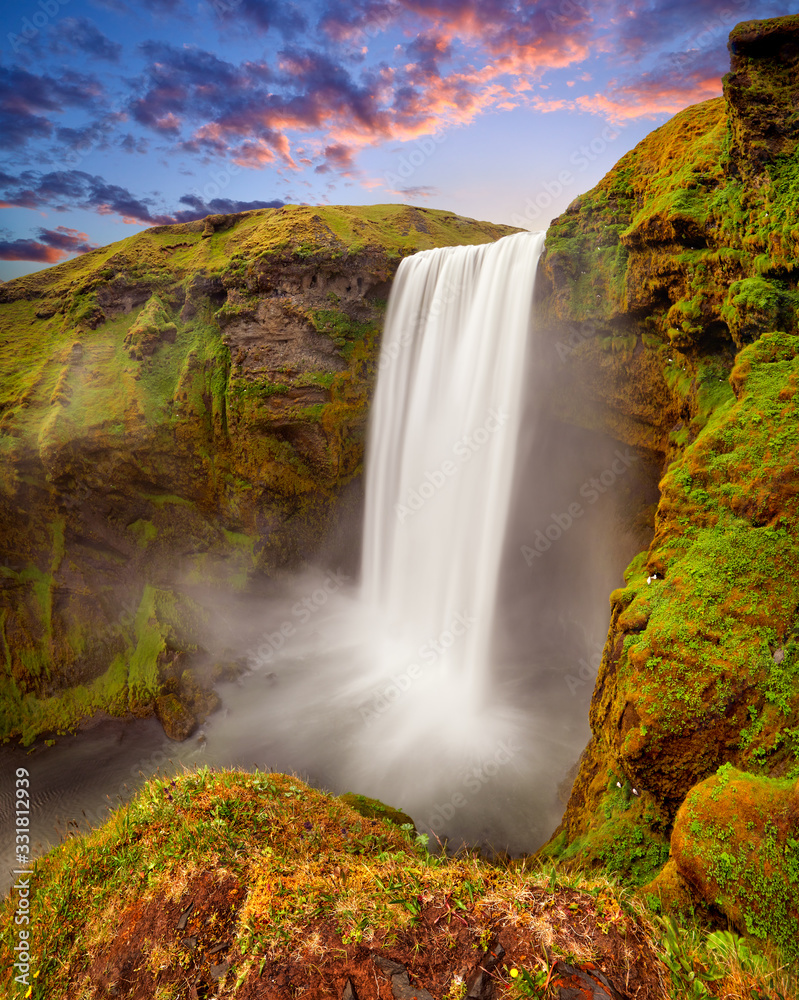 Panoramic view of Skogafoss waterfall on the Skoga river, a popular tourist attraction and part of the Golden Circle Tourist Route. Famous landmark of Iceland, Europe. Travelling concept background.