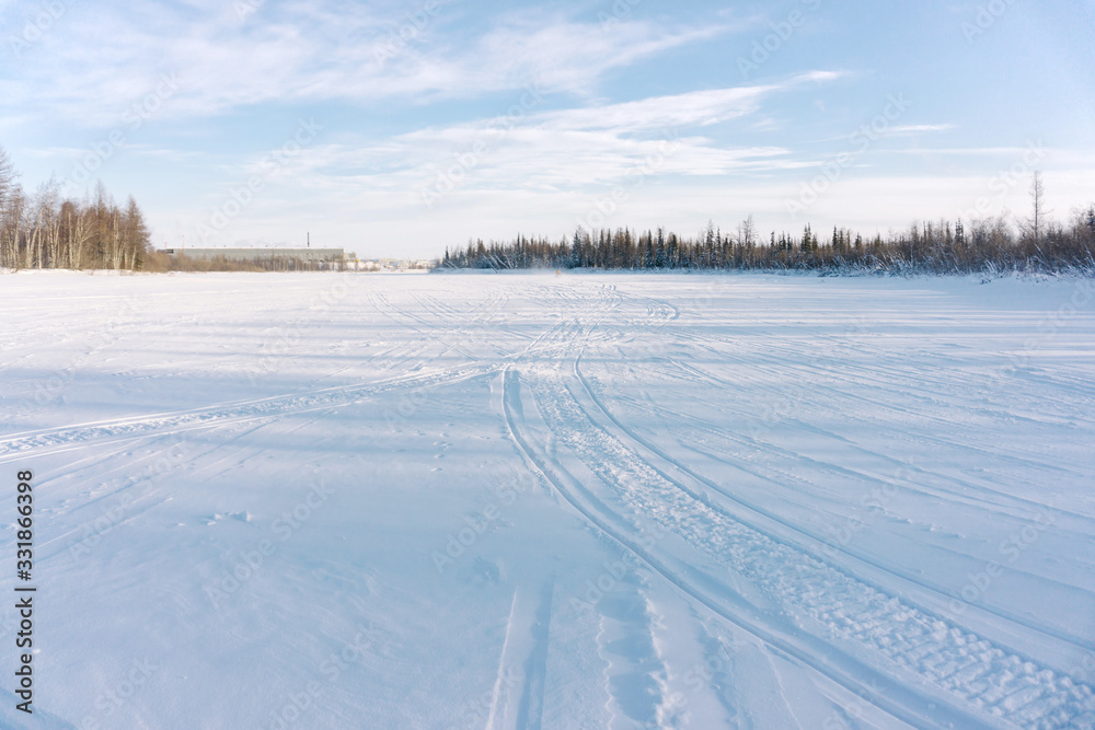 a large empty area covered with snow and snowmobile tracks. A guy in a yellow jacket rides a snowmobile