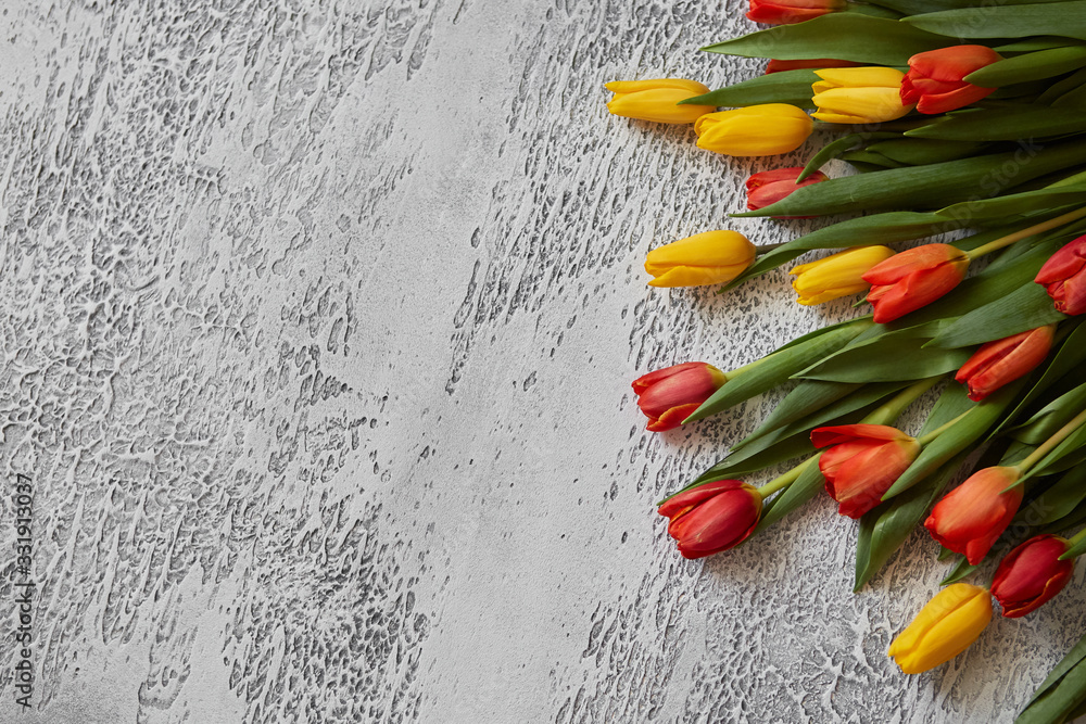 Beautiful tulips on a white textured background, top view, frame, border. Postcard with tulips for any event with space for text