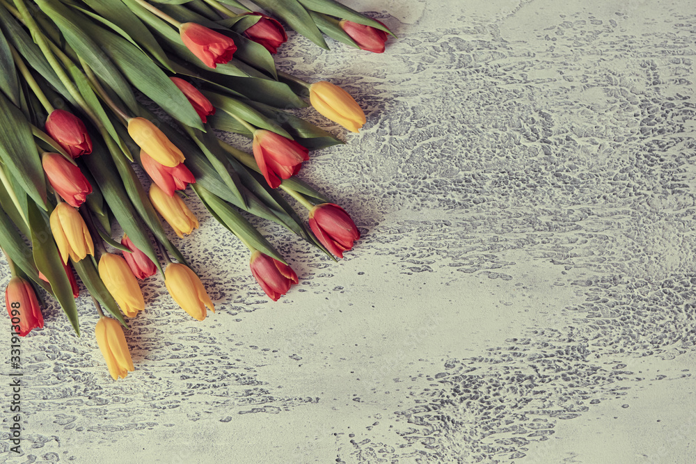 Beautiful tulips on a white textured background, top view, frame, border. Postcard with tulips for any event with space for text