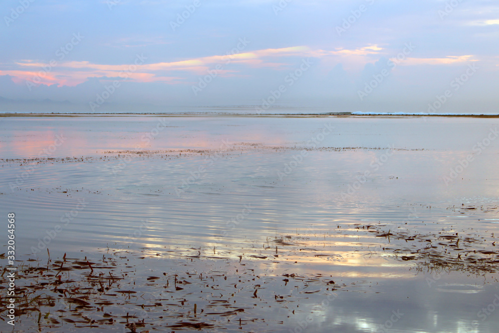 Tranquil background of Blue sky and the sunrise light over the sea horizon.