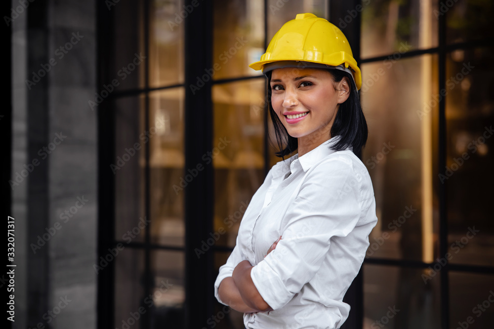 Portrait of a Confident Construction Engineer Woman. Smiling and Looking at Camera. Standing in front of the Modern Office Building