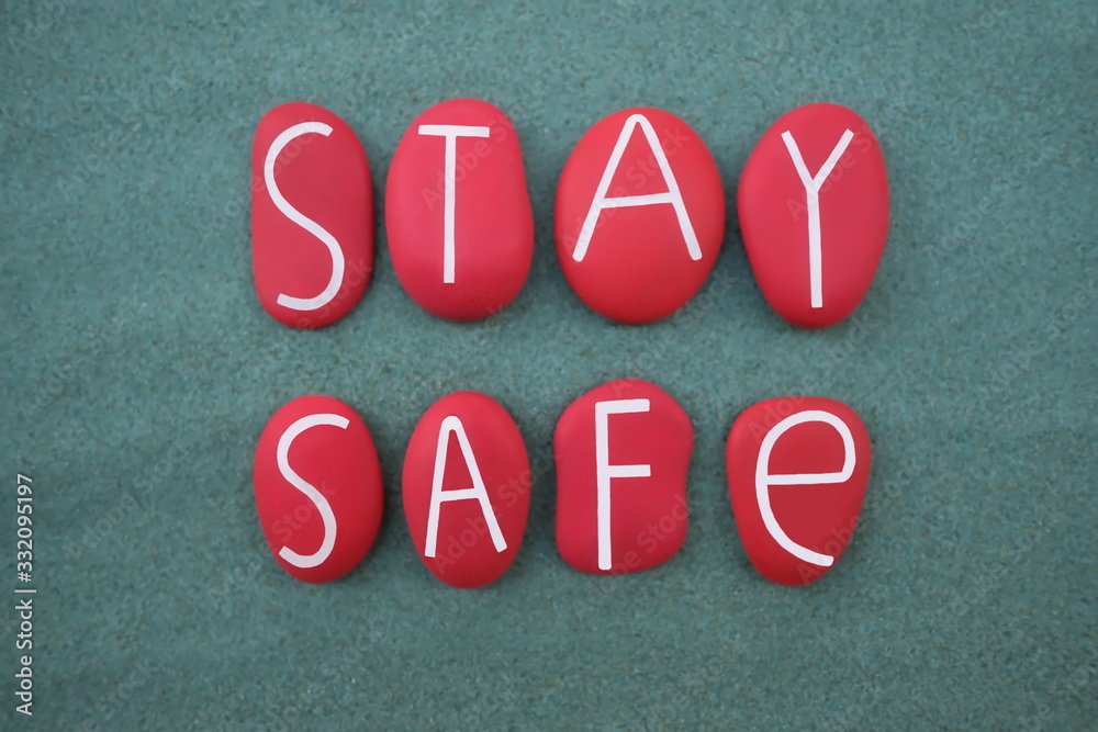 Stay Safe, creative slogan composed with red colored painted stone letters over green sand