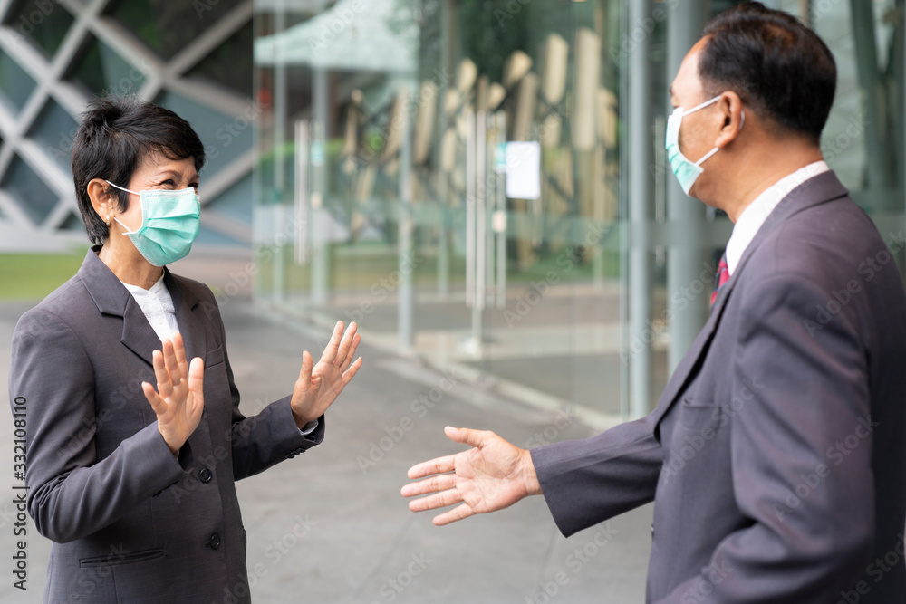 Old asian business people no greeting by shakehands togather and use a mask for prevent covid 19