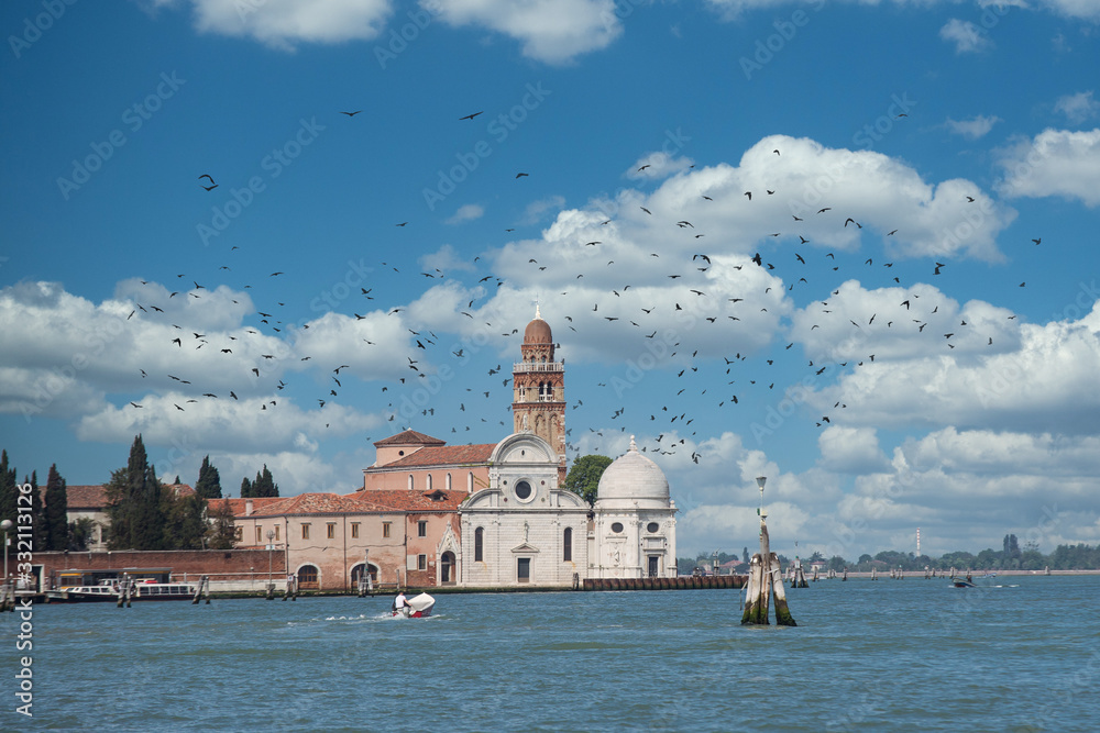 A boat speeding across Grand Canal in Venice toward old church