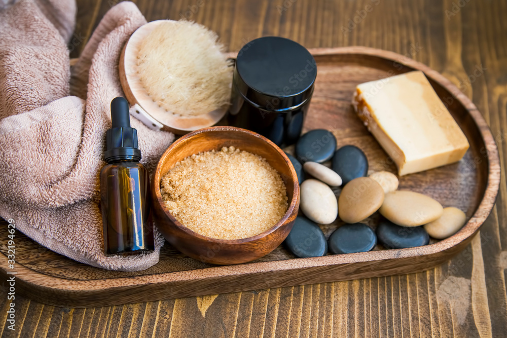 Spa still life with massage stones, brown sugar scrub, body oil and brush, cotton towel on wooden rustic tray, home spa