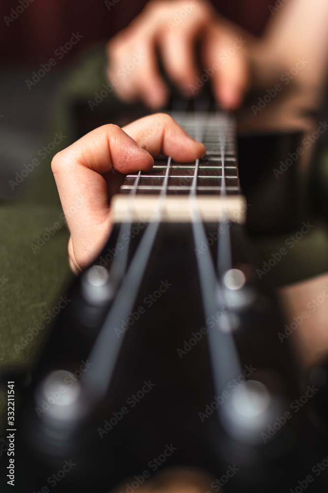 children's fingers playing on a black ukulele. vulture, strings, fingers close-up. vertical