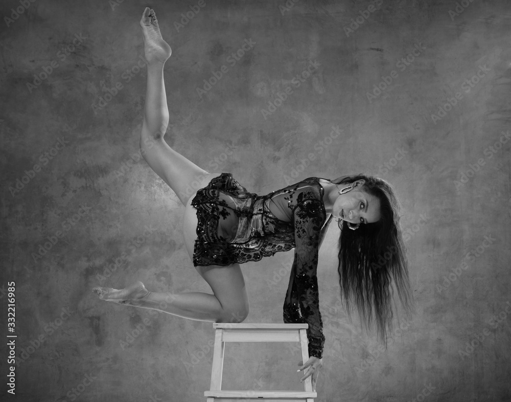 Beautiful acrobatic in white lace lingerie posing on the wooden chair stepladder in the studio over concrete wall background - black and white photography
