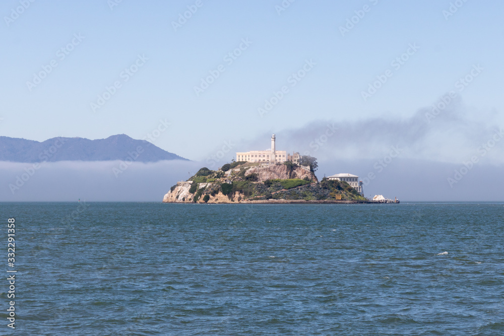 San Francisco, USA - March 2020 - View of Alcatraz Island in San Francisco, California, on a foggy day. Feredal prison.