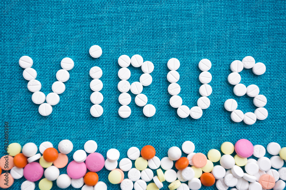 The inscription virus made of white capsules on a blue background. Below is a scattering of multi-colored tablets. The concept of the treatment of dangerous deadly coronavirus. Free space