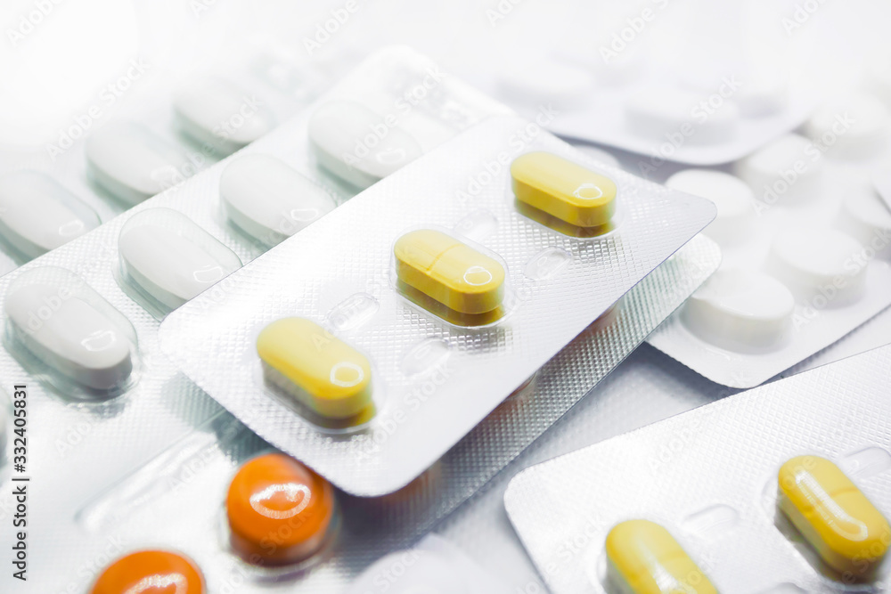 The concept of pills for treatment. Multi-colored pills in blisters on a white background isolate. Copy space.