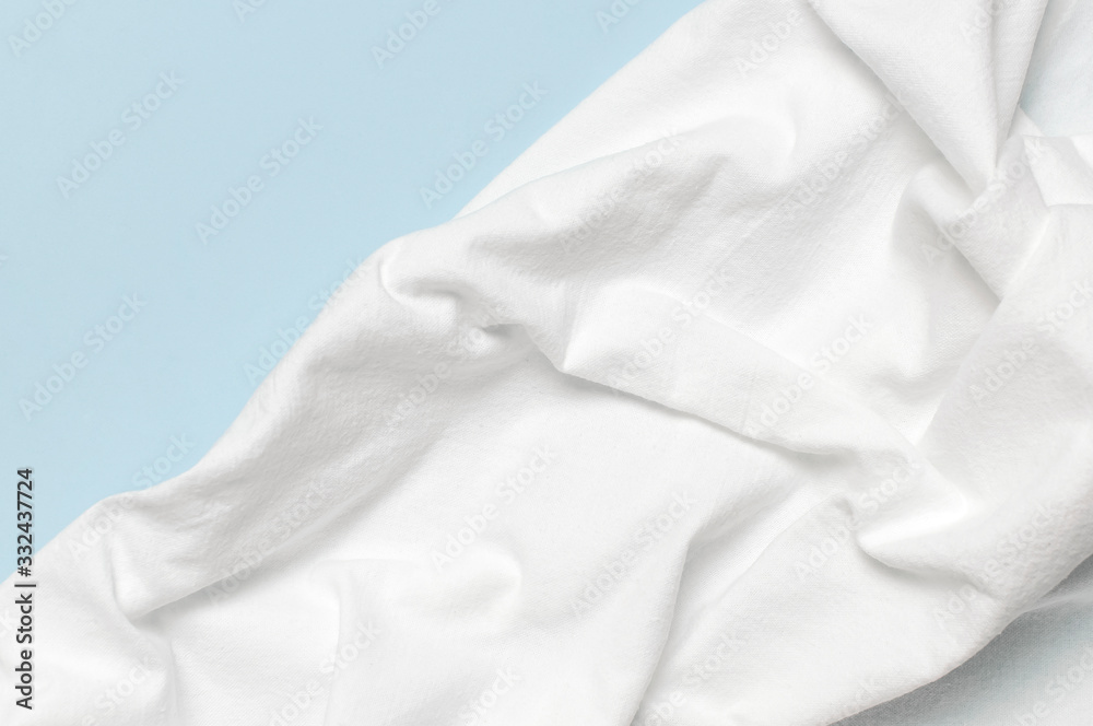 White crumpled natural cotton fabric on delicate blue background top view flat lay with copy space. Natural linen background. Eco textiles. White Fabric texture. Fabric backdrop