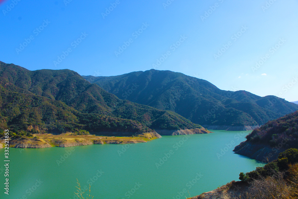 a beautiful summer landscape along the San Gabriel River with majestic mountain ranges, lush green trees and blue sky at azusa wilderness park in Azusa California USA