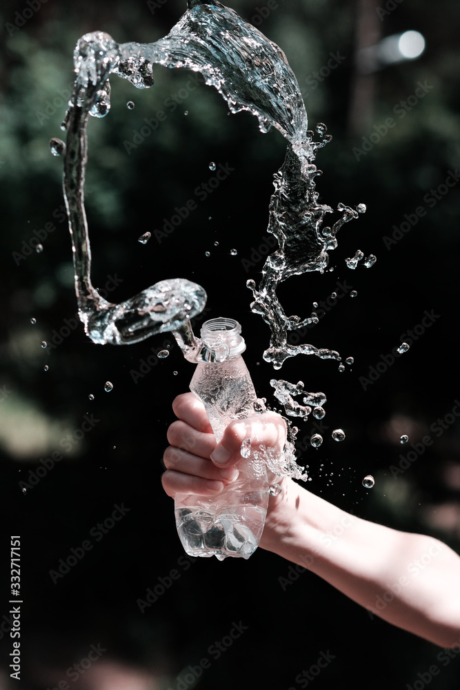 Hand with drinking water pours water. The conditions of the water and environmental crisis
