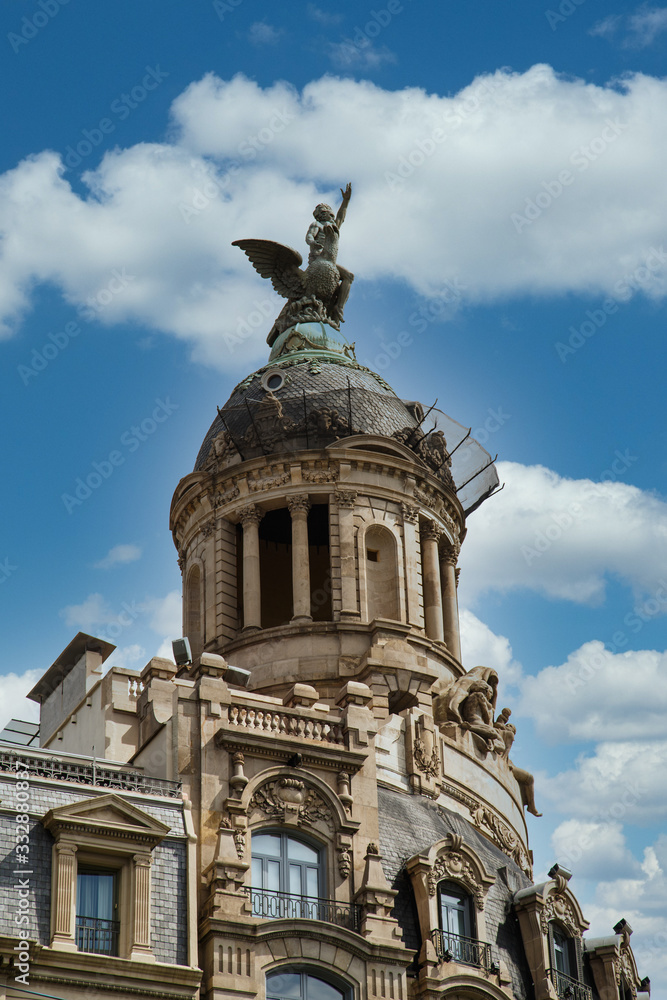 A winged statue on a domed building in Barcelona, Spain