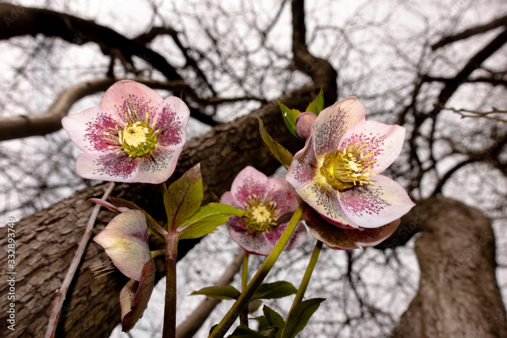 Christrosen bunt gegen Himmel mit Ästen gestellt