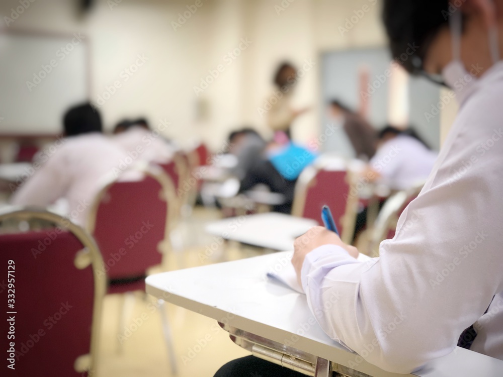 soft focus of undergraduate student in university holding pencil writing on paper answer sheet.sitting on red lecture chair taking final exam attending in examination room or classroom. vintage tone.