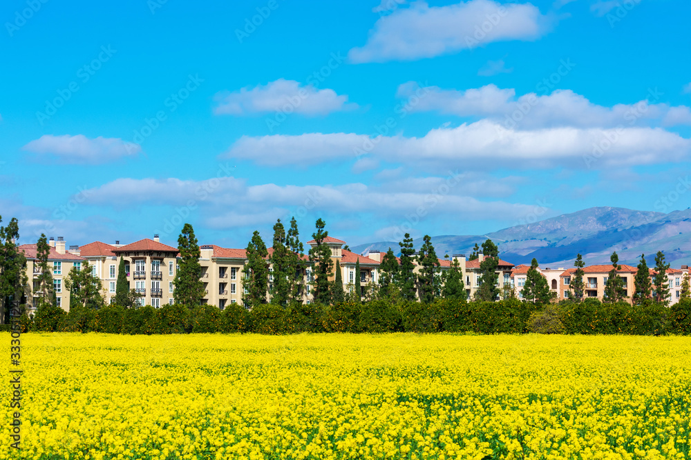Scenic view of a beautiful blooming yellow mustard field in a residential neighborhood.